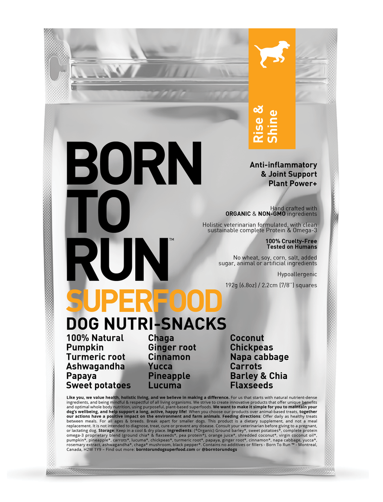 Y-a-t-il une meilleure façon de se réveiller le matin qu’avec le regard attentif et souriant de nos chiens? (Pas mal mieux que le réveille-matin, non ?!) Notre mélange Lever de Bonheur a été créé avec ce « feeling » en tête, et sachant que nos superaliments jaune-oranges contribuent à ce que nos chiens démarrent chaque jour de la bonne patte! L'inflammation est à la source de plusieurs maladies. Nous avons donc conçu un cocktail à partir de 20 supers ingrédients anti-inflammatoires d'origine végétale, reconnus pour protéger le cartilage, aider une meilleure récupération suivant un effort physique, et favoriser une bonne santé des os et des articulations.
